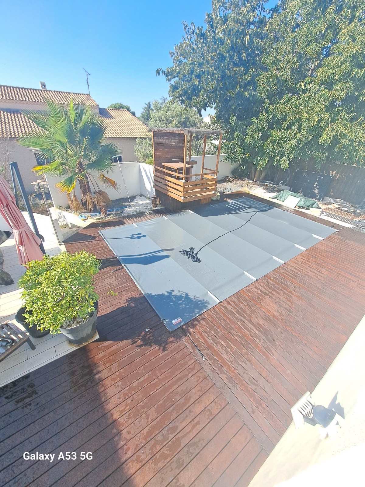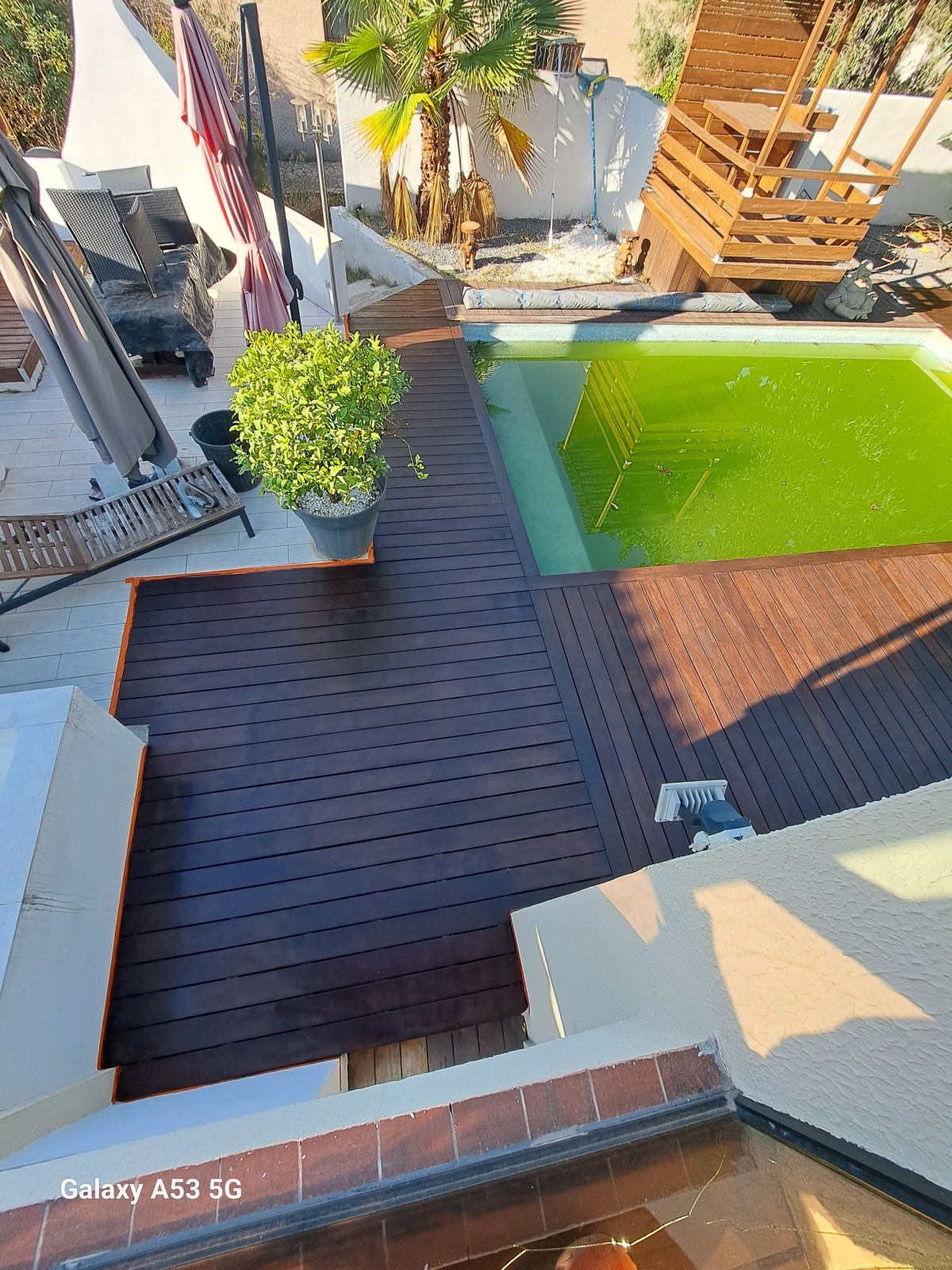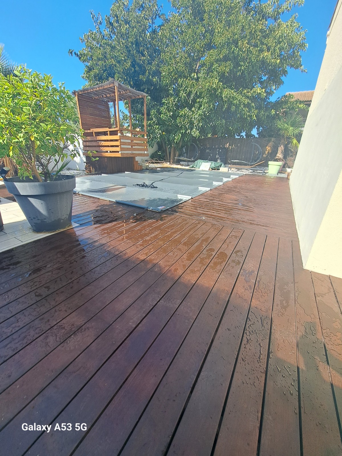 Le bois exotique est naturellement dense et résistant, mais son exposition permanente à l’eau chlorée, au soleil et aux variations de température nécessite un entretien spécifique. Le traitement consiste à appliquer un saturateur ou une huile technique, après un nettoyage et un léger ponçage si besoin. Il est recommandé de procéder par temps sec, sur une surface propre et parfaitement sèche, pour une pénétration optimale du produit.