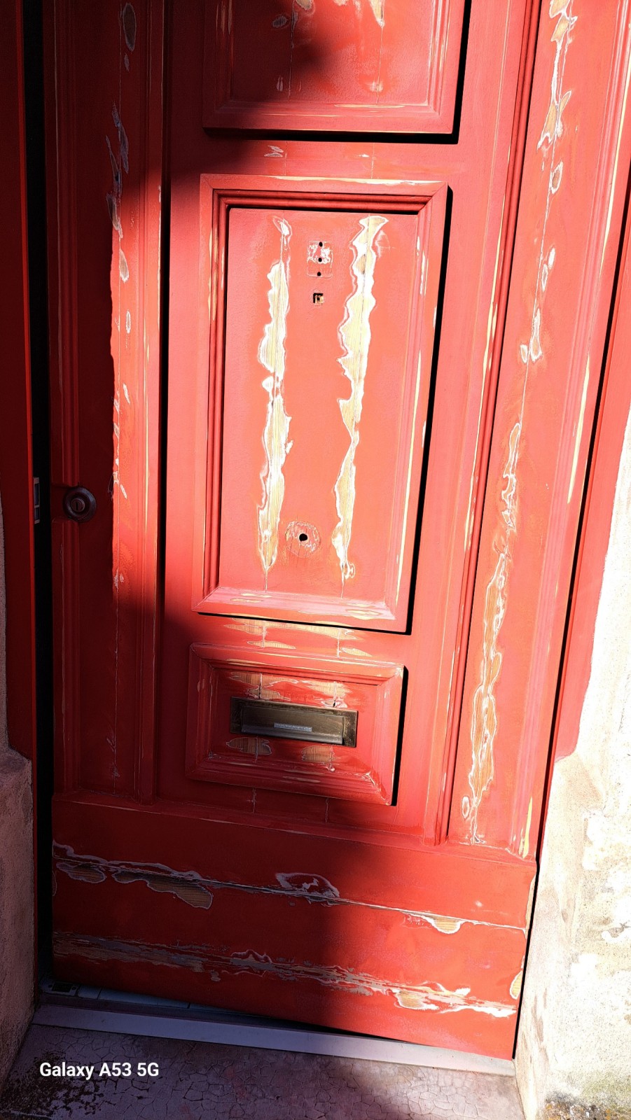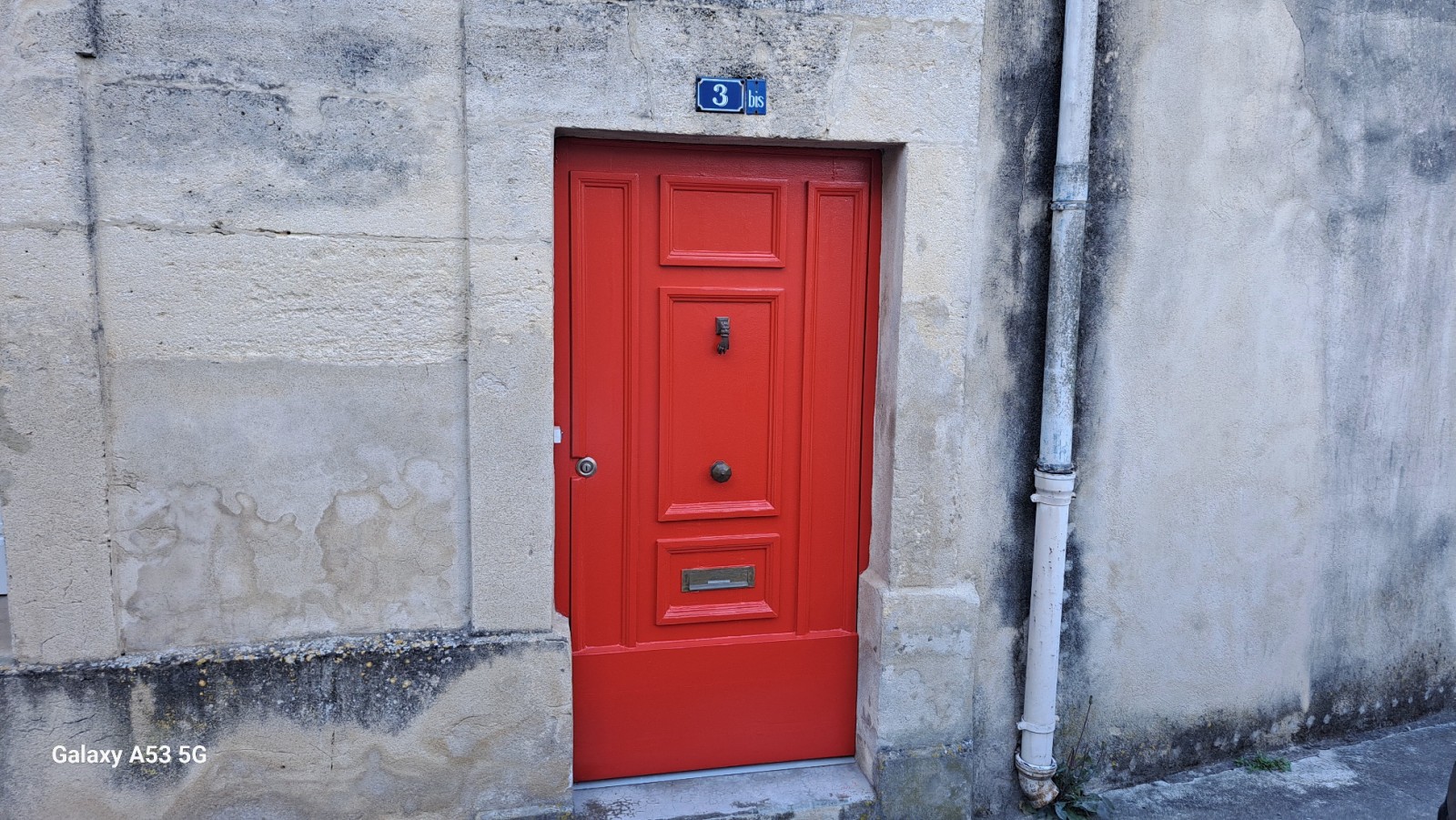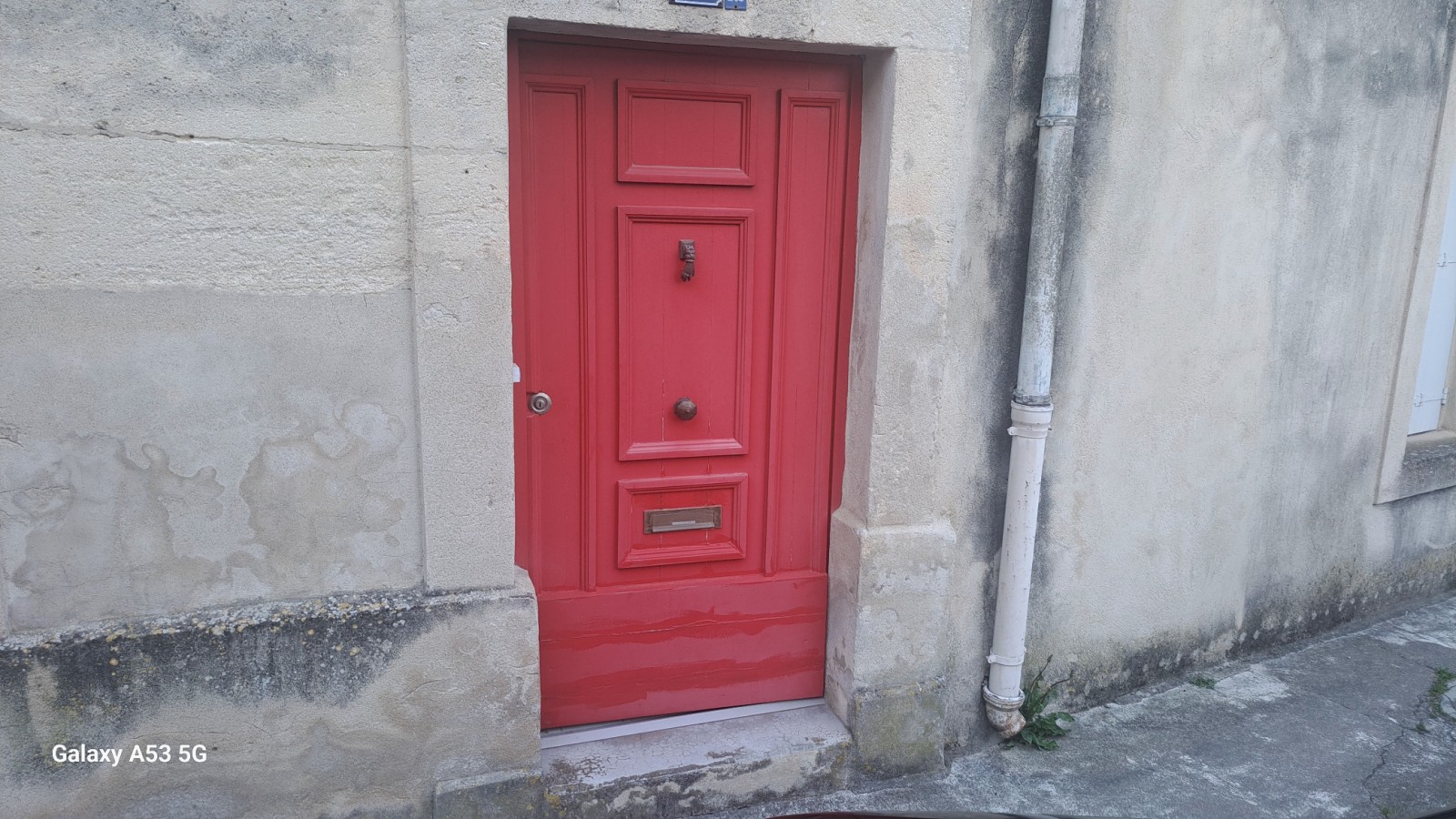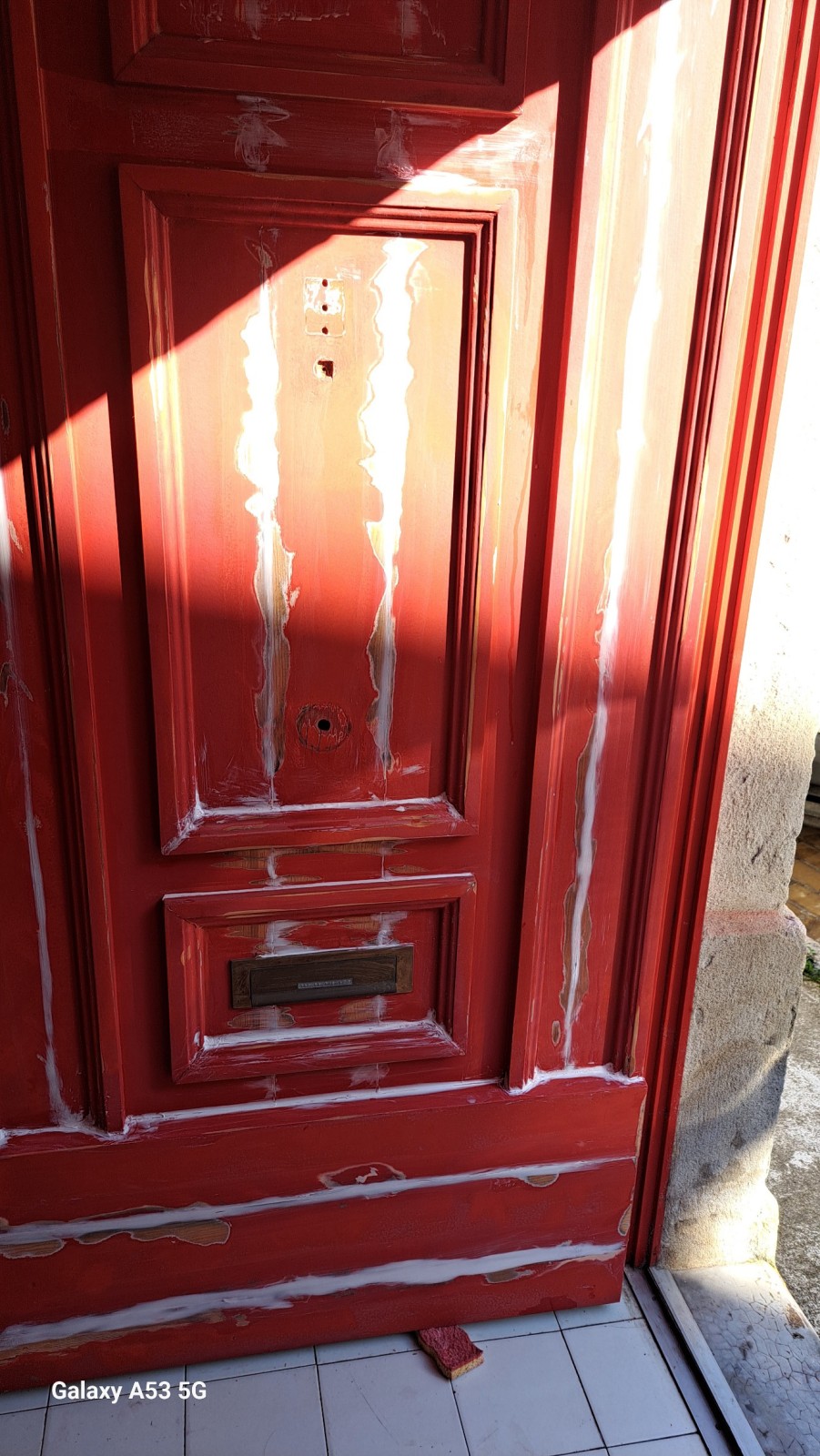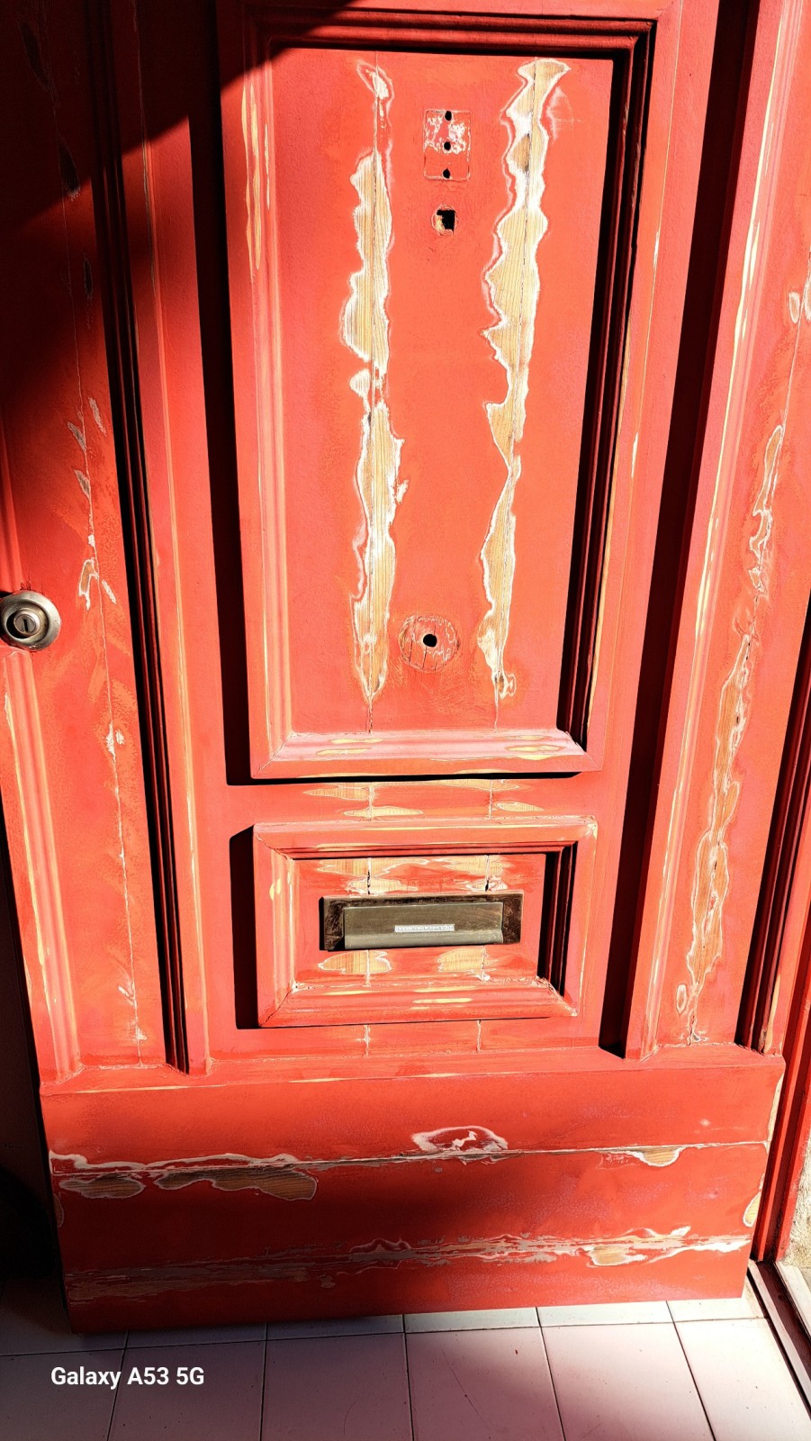 La porte d’entrée a bénéficié du même soin, avec un ponçage soigneux suivi d’une application de peinture protectrice et décorative, redonnant éclat et protection à cet élément essentiel.